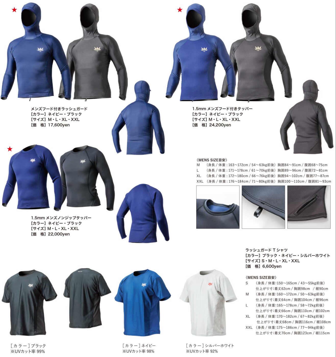 メンズはフード付きラッシュガード、フード付きタッパー、ノンジップタッパー、ラッシュガードTシャツをご用意しています。