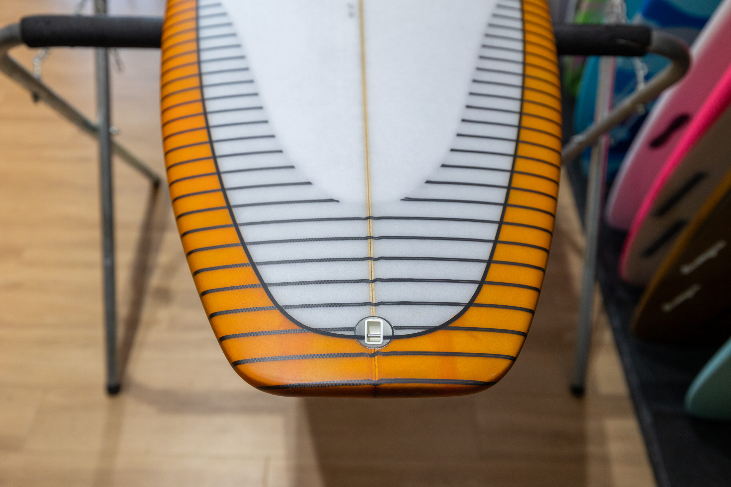 これができるのは、シェイパーのYOSHIROさんがハンファー前の海に入っていて、ここの「小波」の意味を肌感覚で知ってくれているから。「これくらい差をつけないと楽しめないよ」という答えが、このシェイプに現れています。