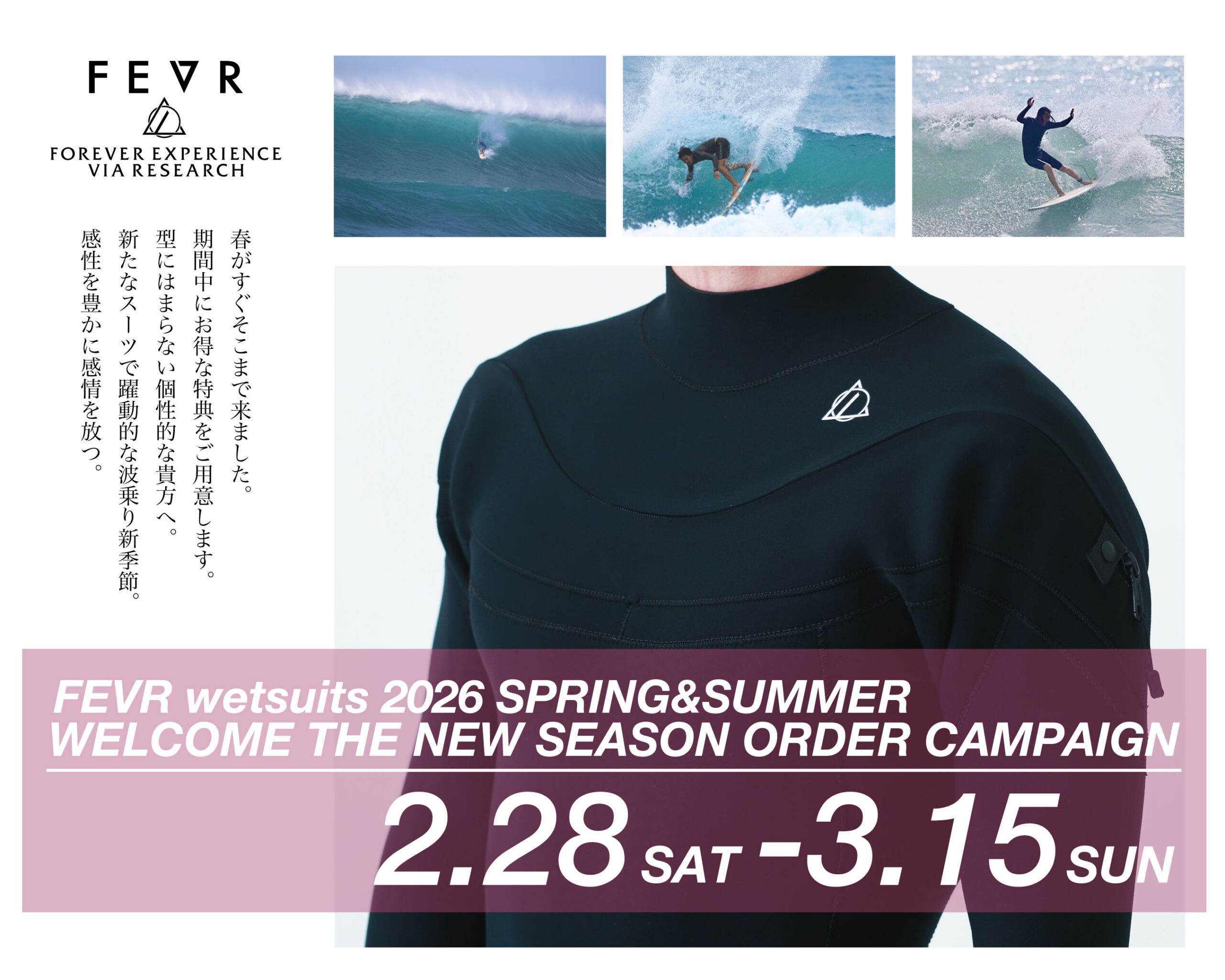 FEVRウェットスーツのオーダーキャンペーンが2月28日(土)からスタートします。期間中のオーダーで、通常かかるオーダー料やオプション費用がサービスに。自分の体にぴったり合ったウェットを仕立てる、年に一度のチャンスです。