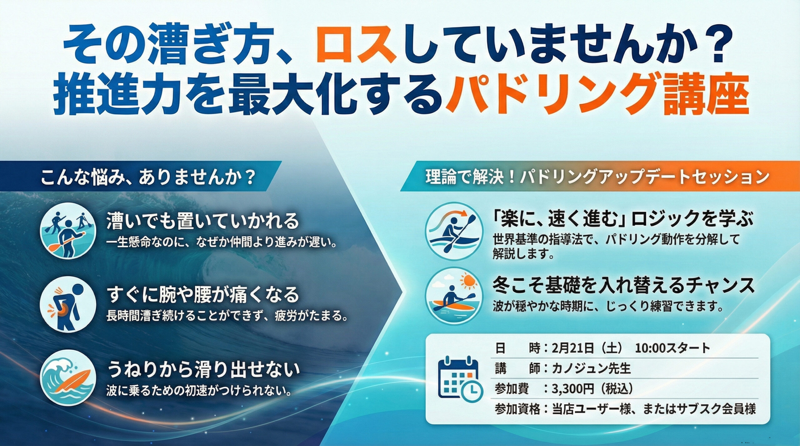 皆様の多くのお悩みにお応えし、パドリング特化型の講習会を開催します。