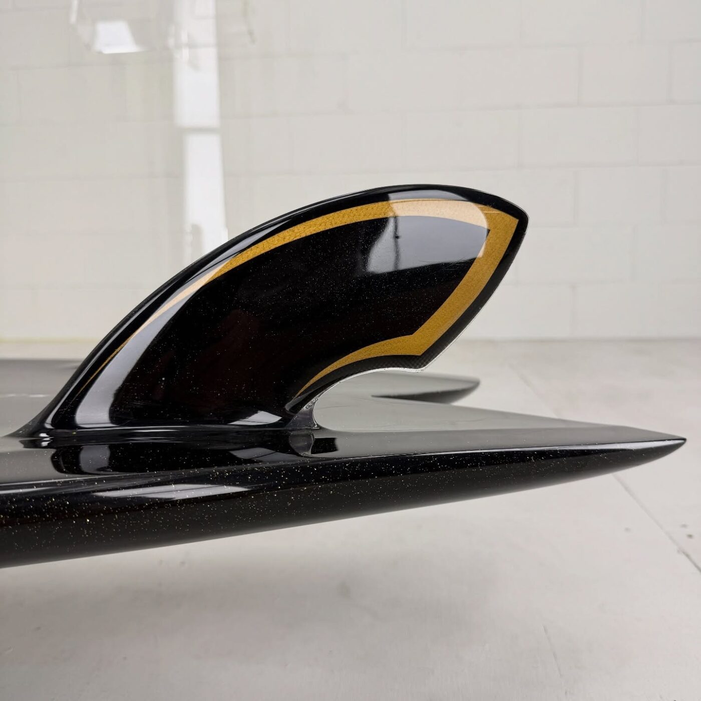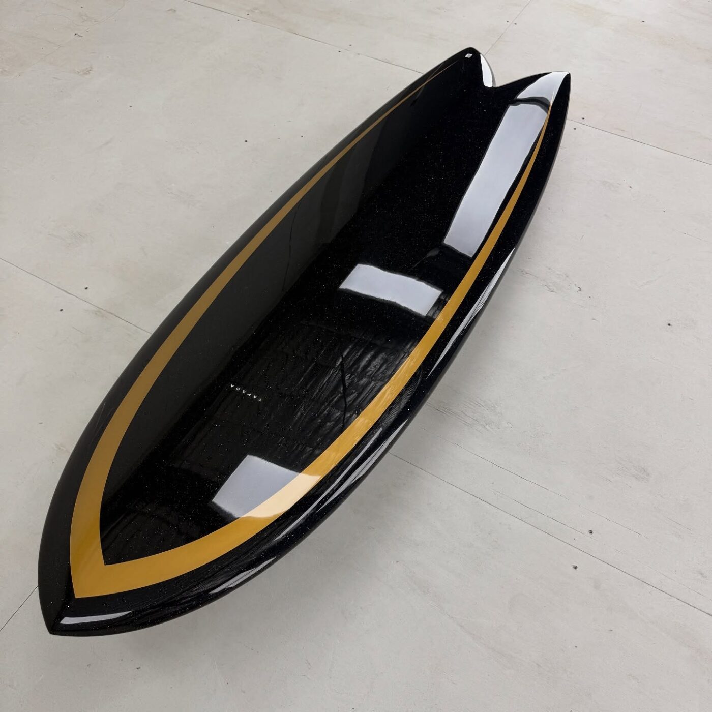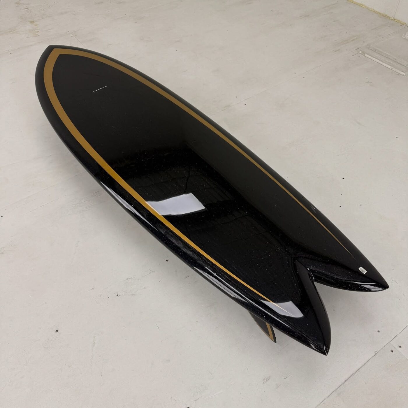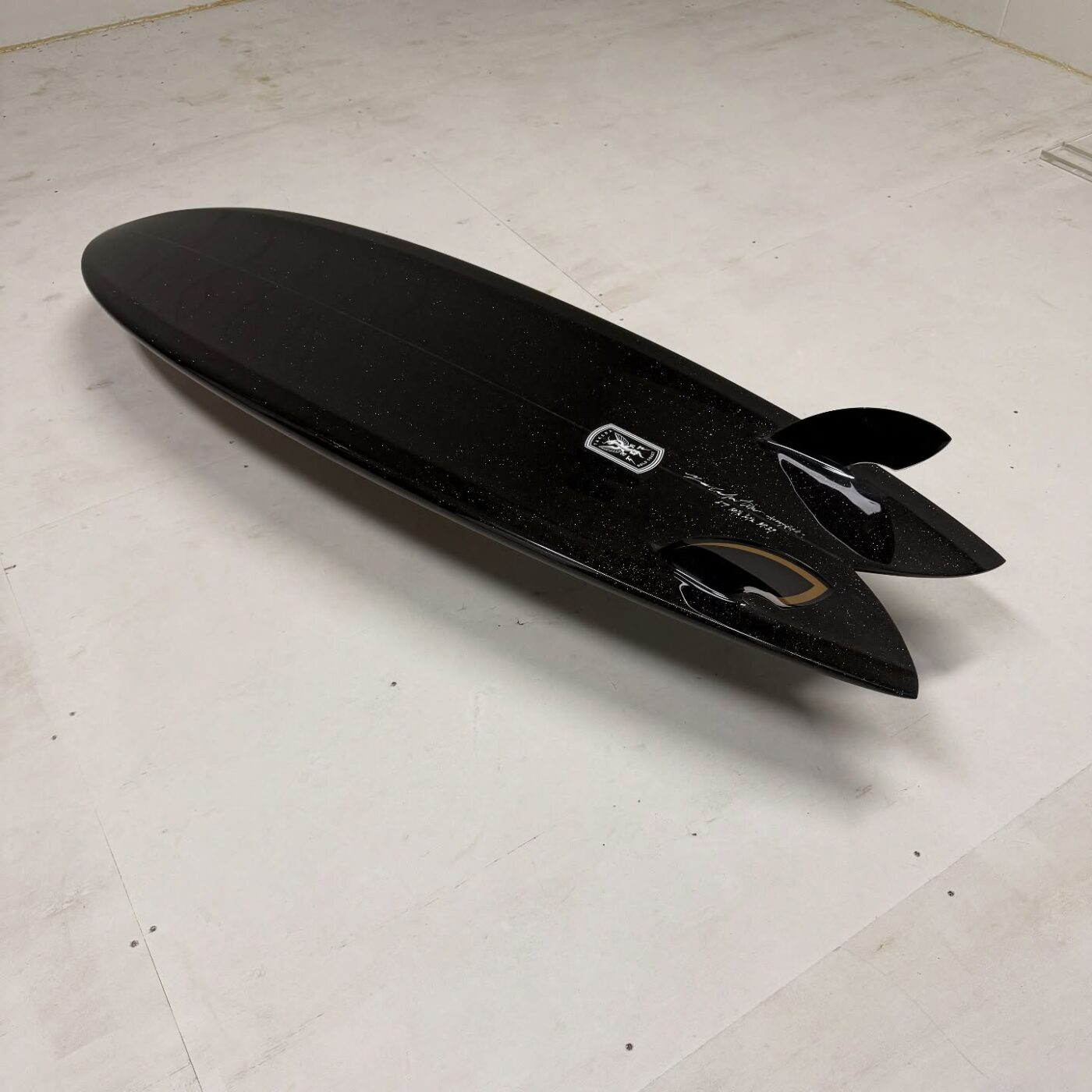 - カラーと光沢: ボトムにはBurford BLUE 5oz、デッキには6ozに+4ozテールパッチの組み合わせ。ブラックピグメントのSilmar Blueポリエステル樹脂が使用され、金色のメタルフレークが散りばめられています。仕上げはグロスポリッシュ仕上げ。深みのある黒に、光が当たるとキラリと輝く美しさは格別です。