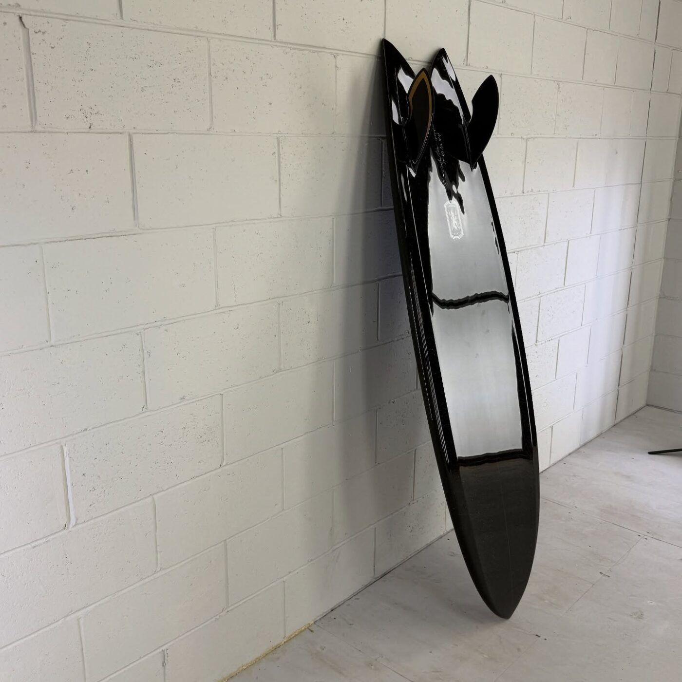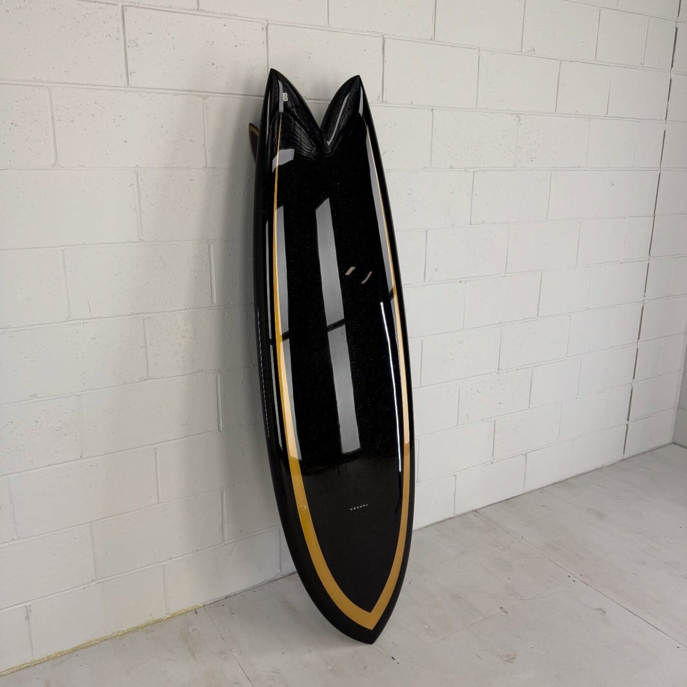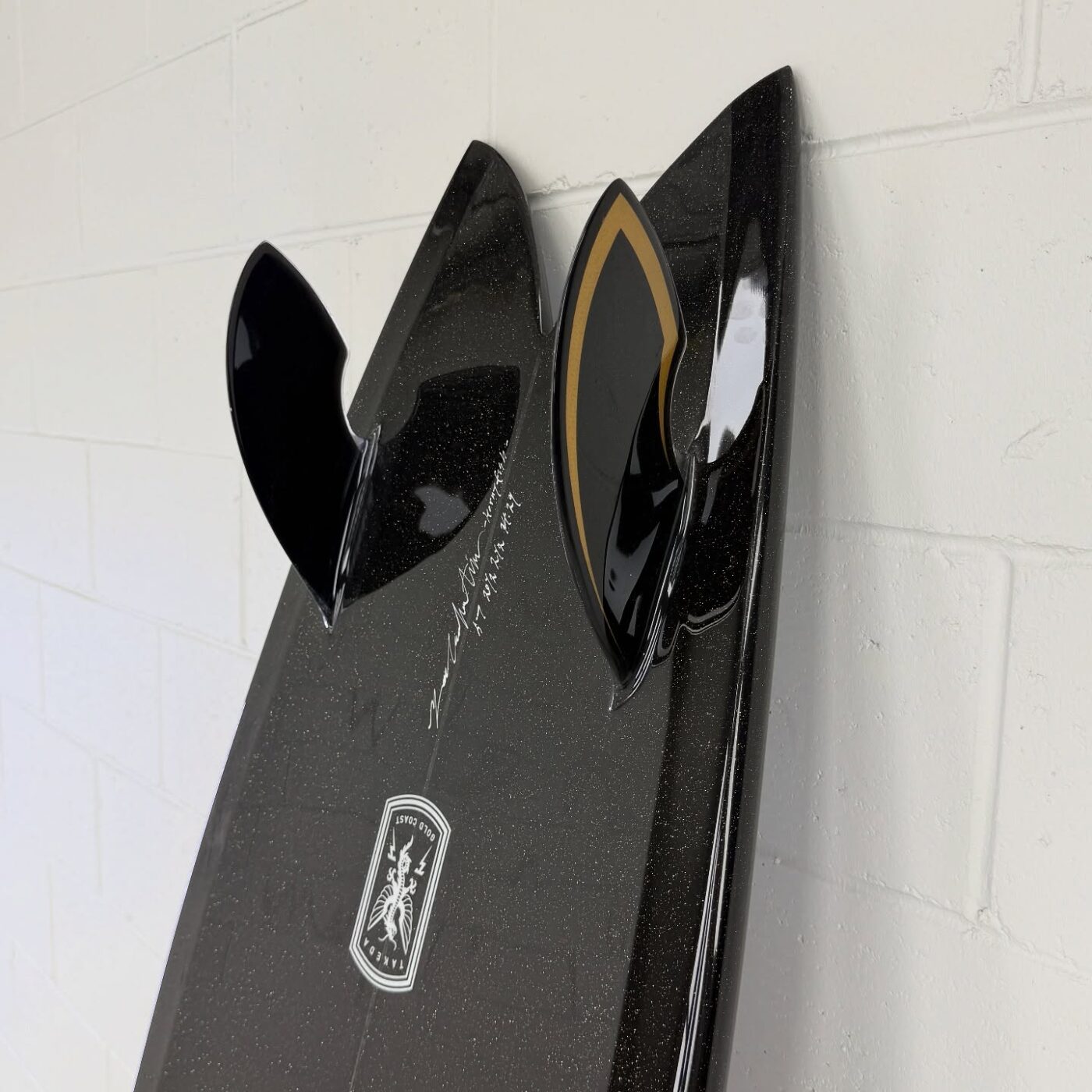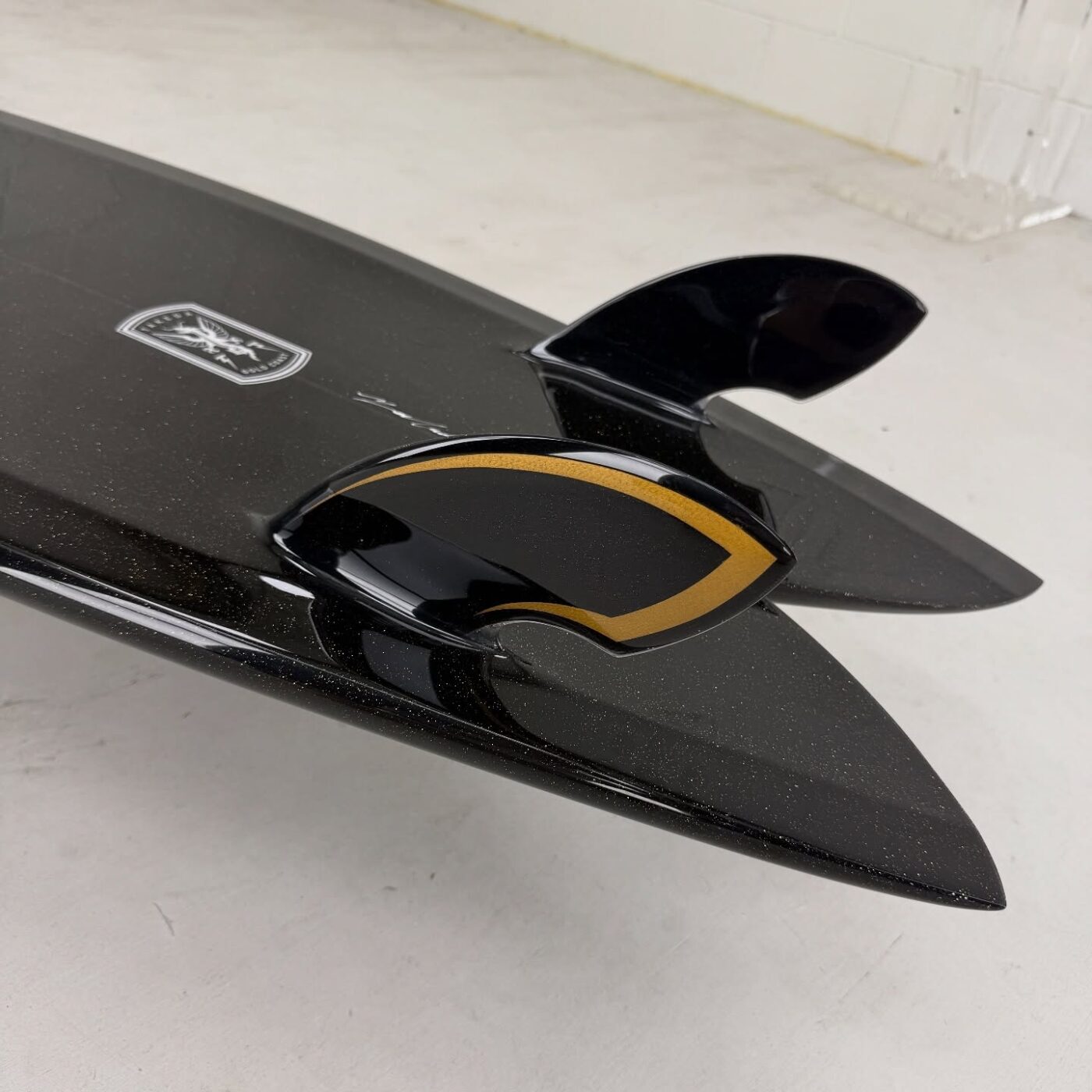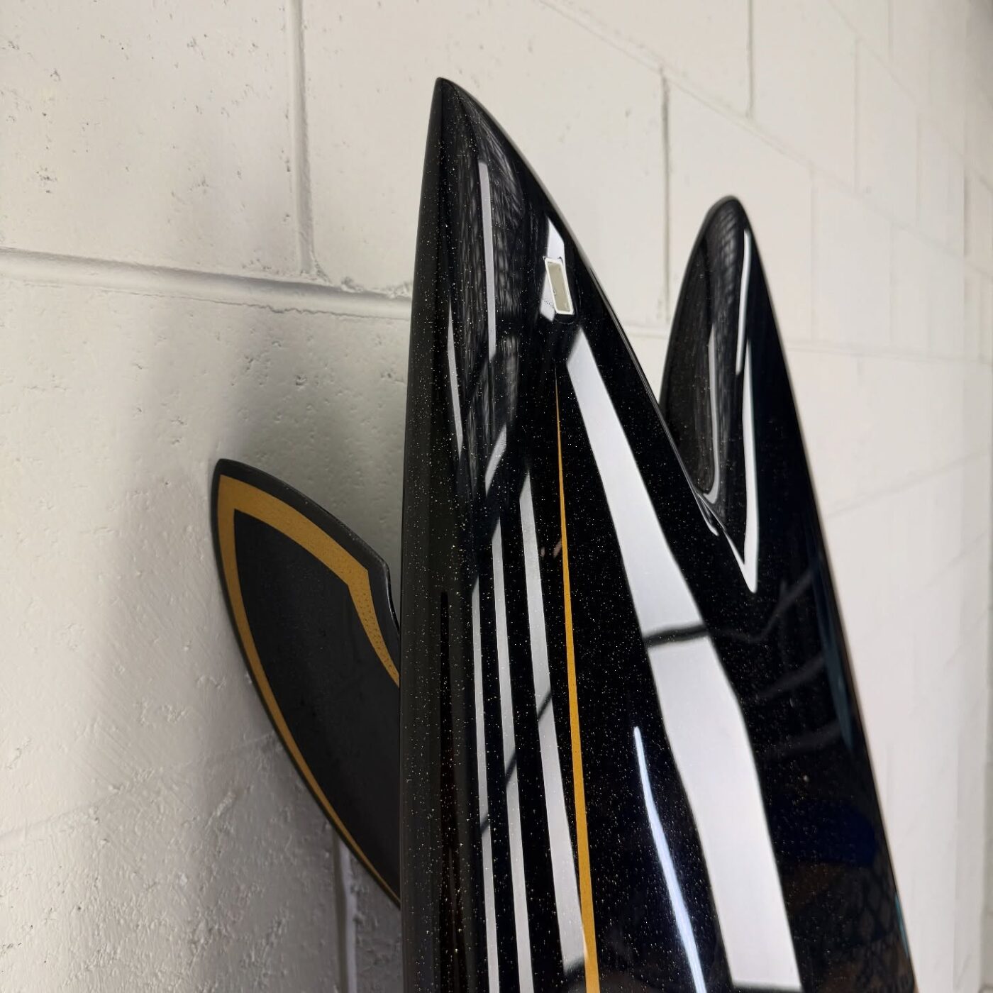 - カラーと光沢: ボトムにはBurford BLUE 5oz、デッキには6ozに+4ozテールパッチの組み合わせ。ブラックピグメントのSilmar Blueポリエステル樹脂が使用され、金色のメタルフレークが散りばめられています。仕上げはグロスポリッシュ仕上げ。深みのある黒に、光が当たるとキラリと輝く美しさは格別です。