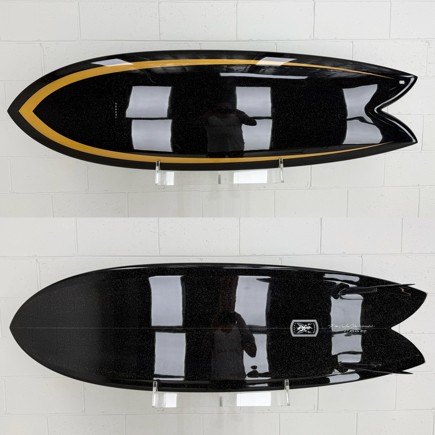 - カラーと光沢: ボトムにはBurford BLUE 5oz、デッキには6ozに+4ozテールパッチの組み合わせ。ブラックピグメントのSilmar Blueポリエステル樹脂が使用され、金色のメタルフレークが散りばめられています。仕上げはグロスポリッシュ仕上げ。深みのある黒に、光が当たるとキラリと輝く美しさは格別です。