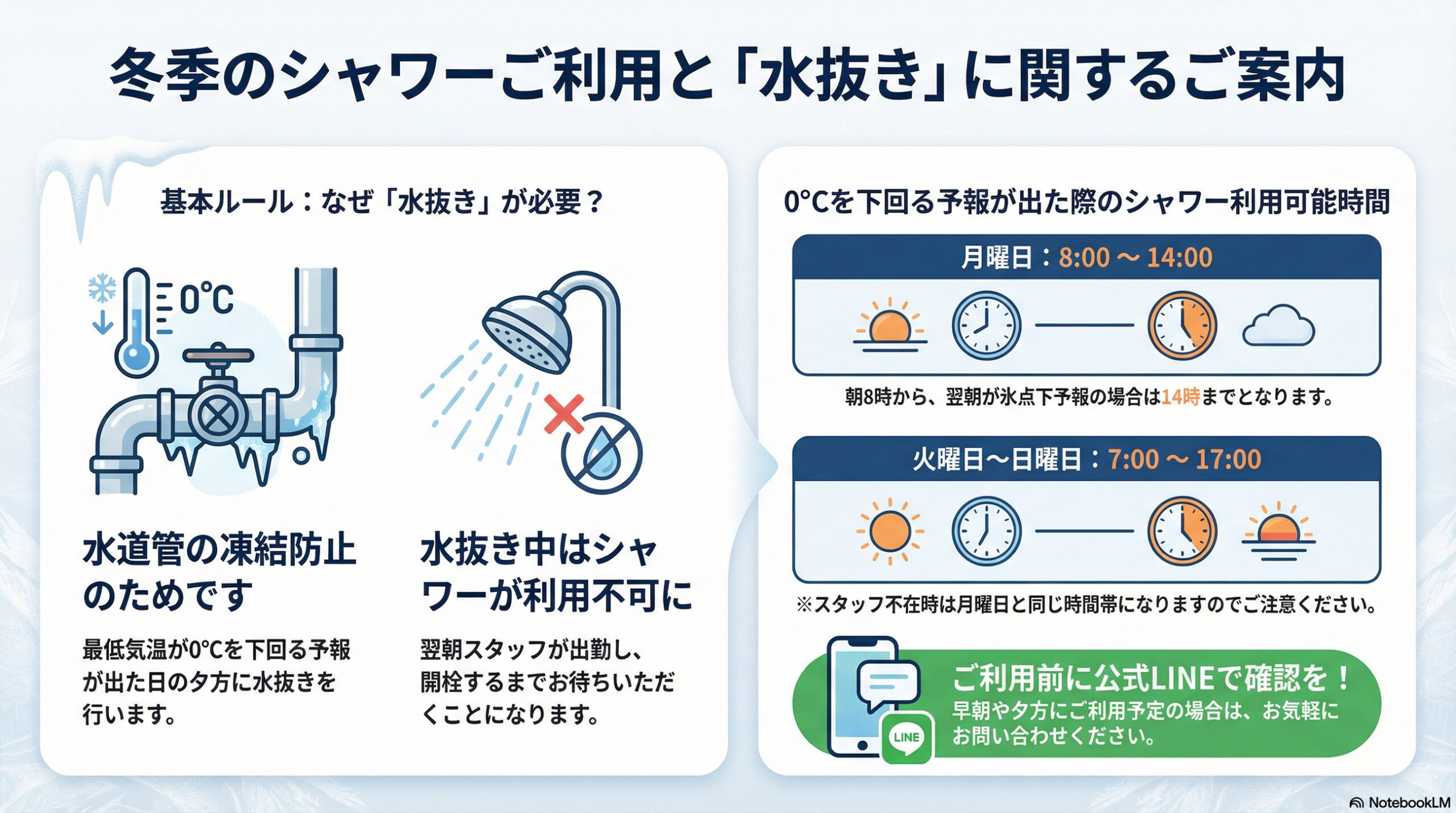 0度を下回る予報の日は、毎週月曜日のみシャワーご利用時間を「8時〜14時」とさせていただきます。