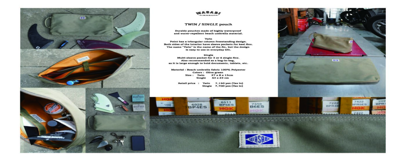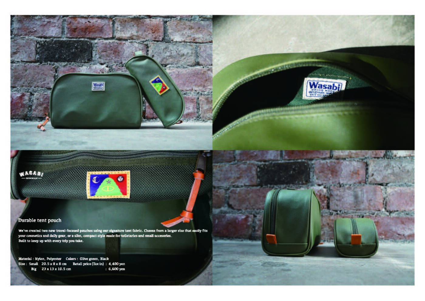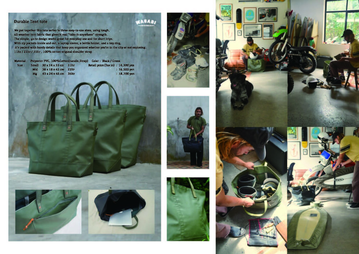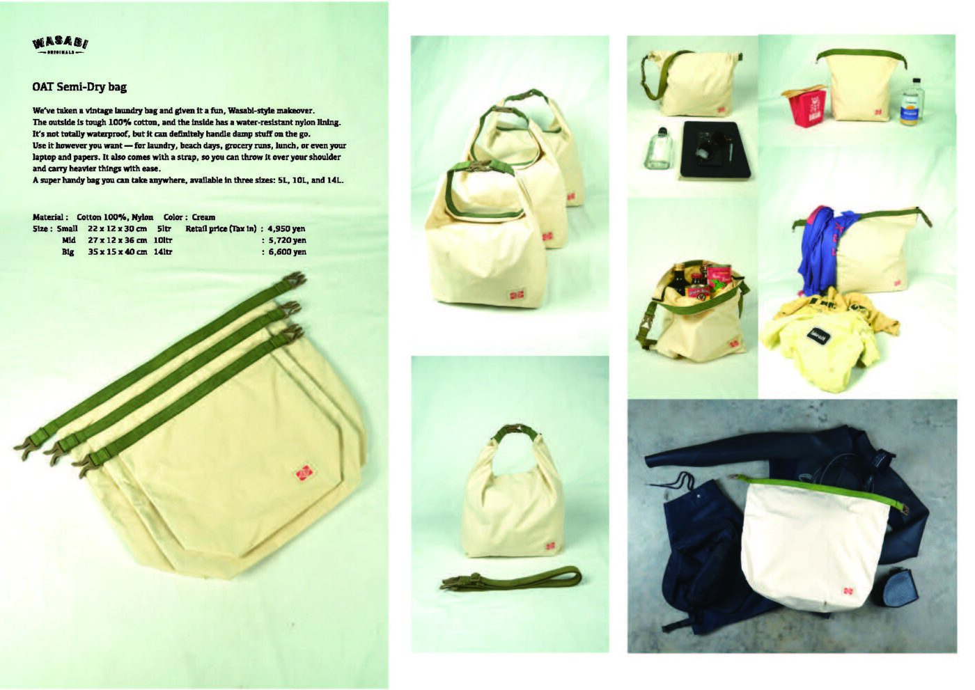 今季も、定番モデルを継続しつつ、新シリーズのトートバッグ、小物ケース、多目的ドライバッグなど、WASABIらしいアイテムが揃っています。