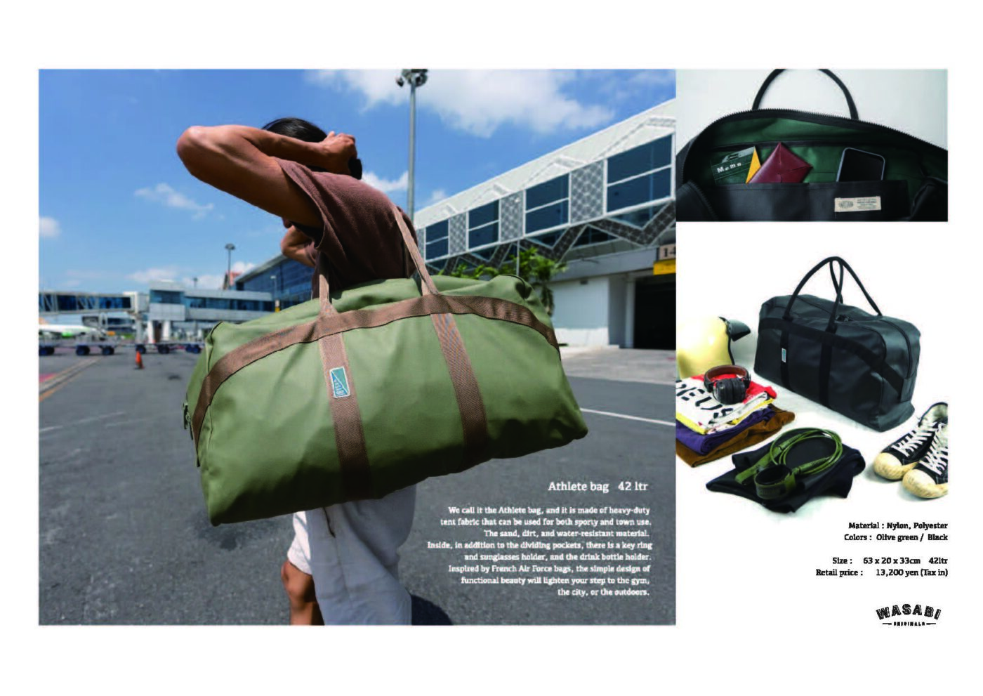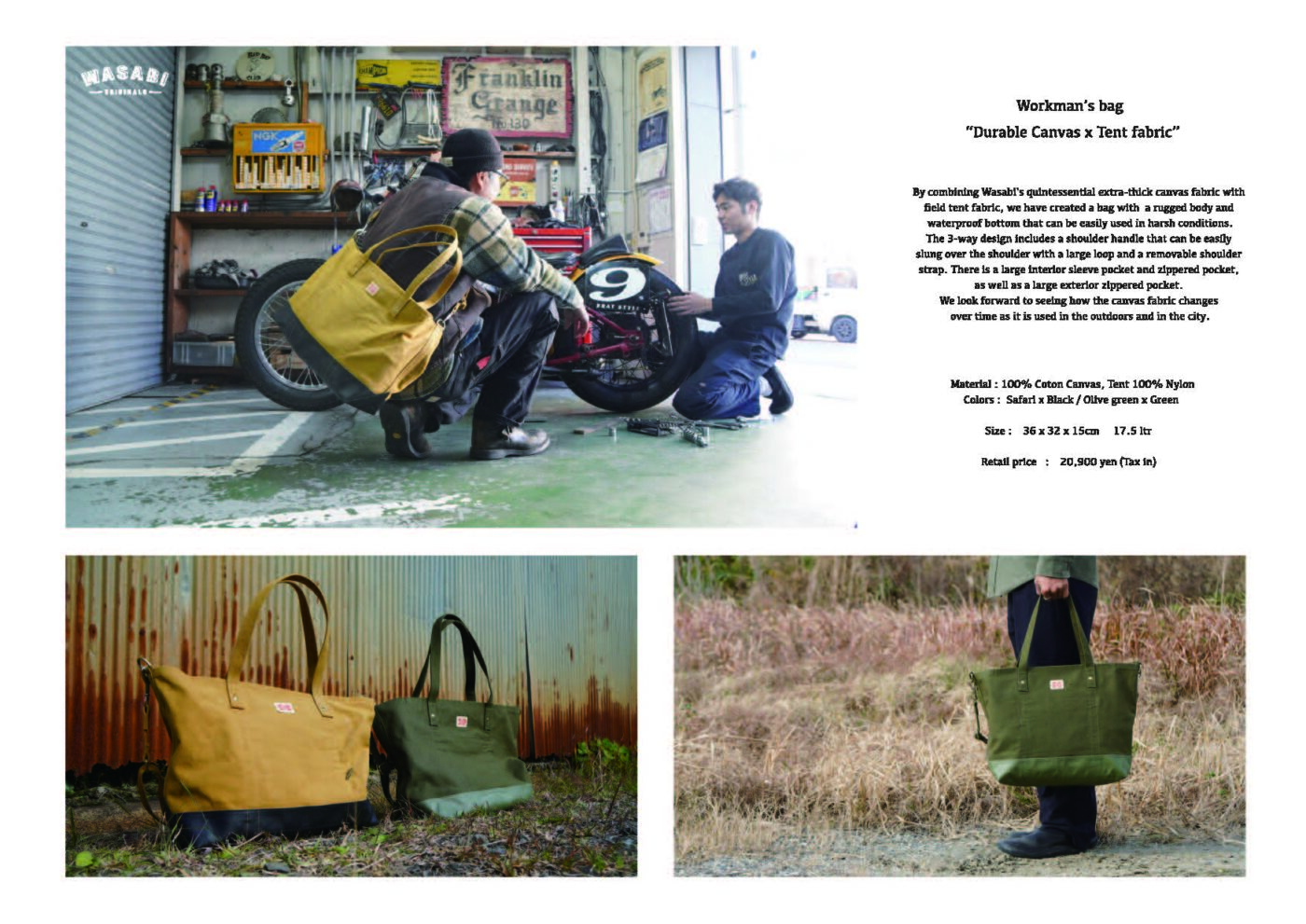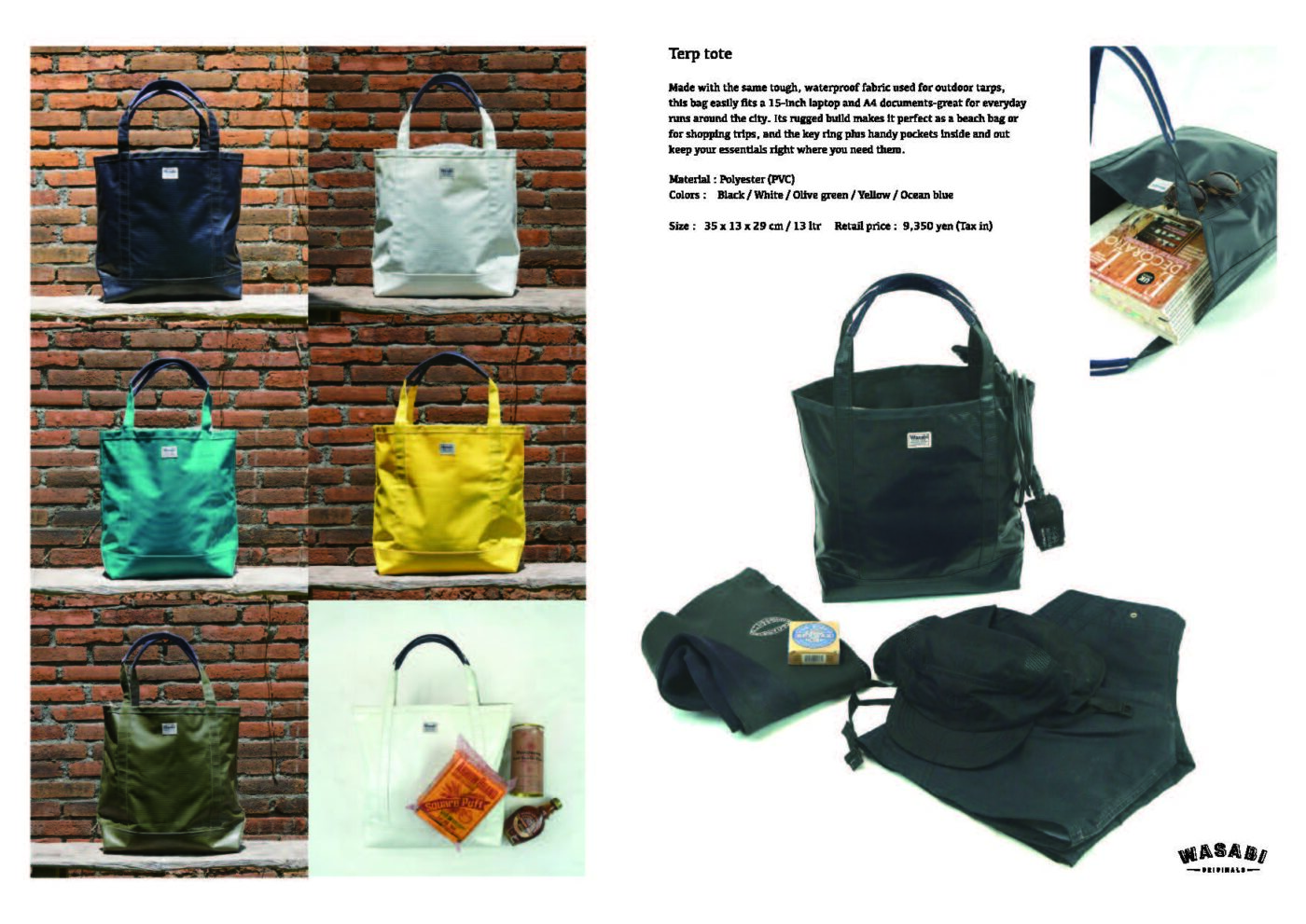 今季も、定番モデルを継続しつつ、新シリーズのトートバッグ、小物ケース、多目的ドライバッグなど、WASABIらしいアイテムが揃っています。